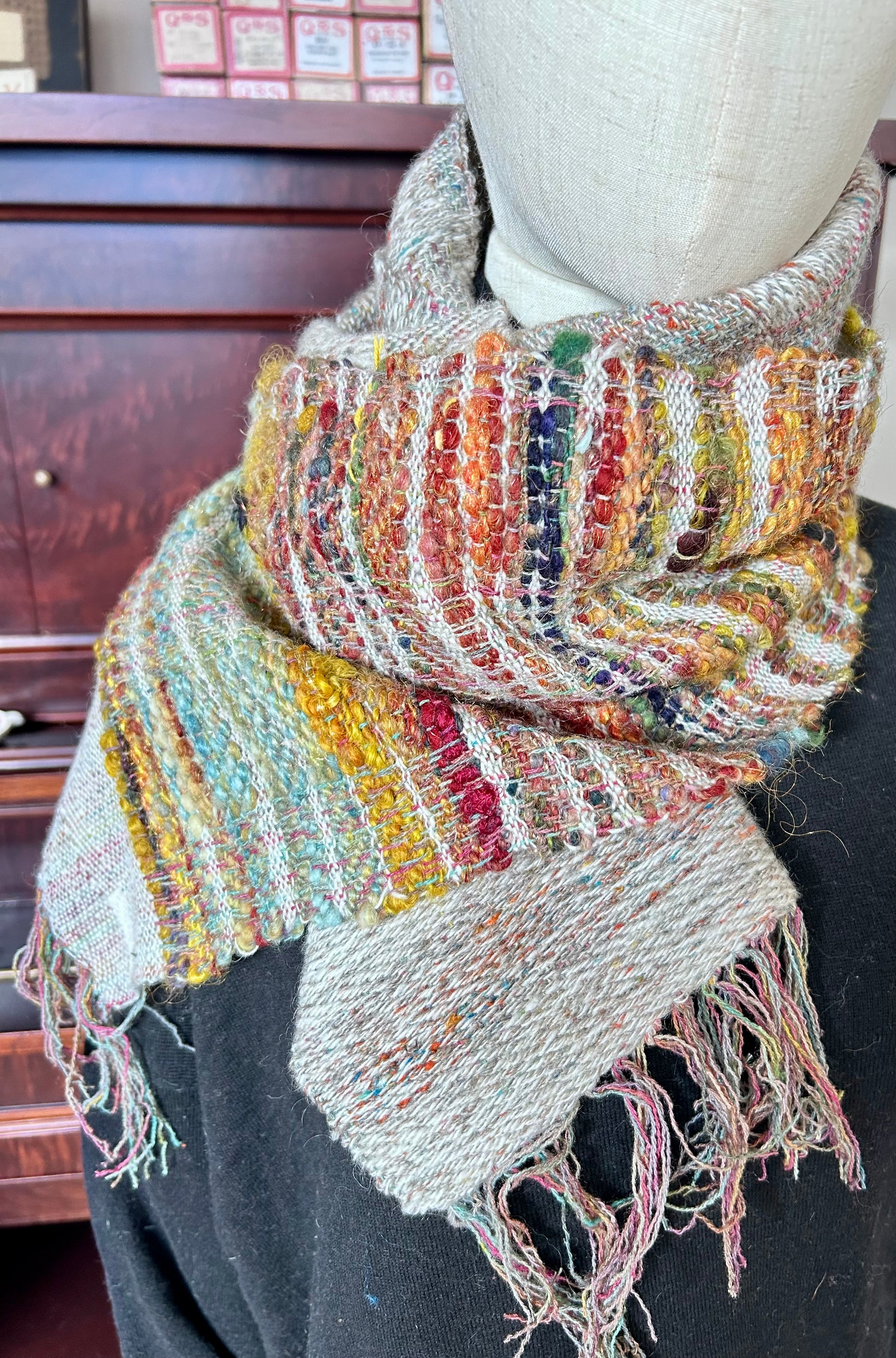 Crafted from a silk warp and soft handspun wool weft, this color-shifting scarf offers both warmth and elegance ideal for fall and winter.