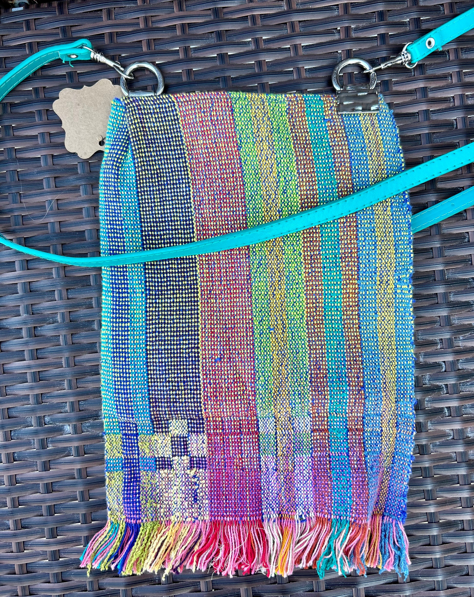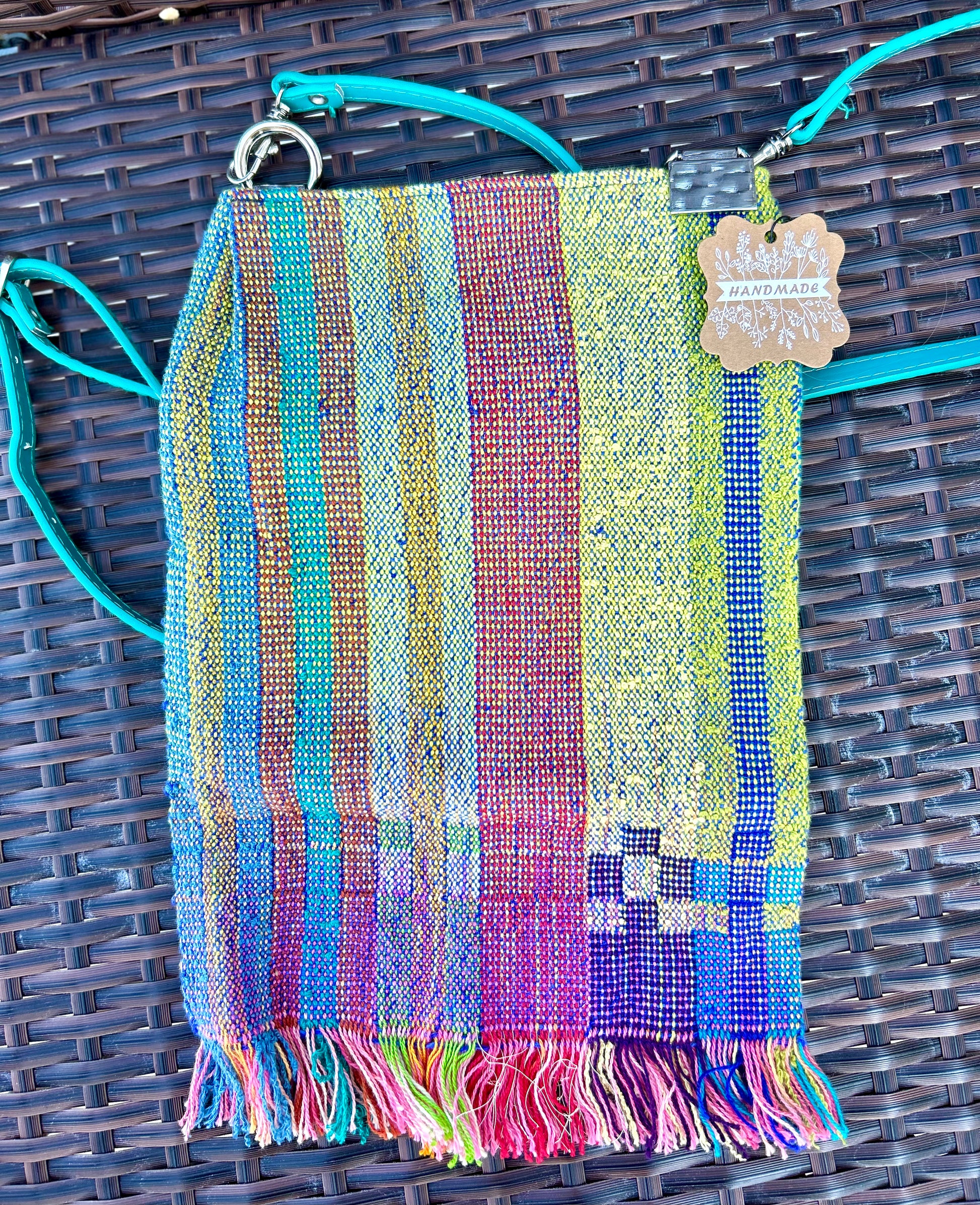 This beautiful handbag is colorful and perfect for a sunny spring day! This handwoven cotton with a little bit of sparkle bag is lined with cotton. It's the perfect size for your phone and a few essentials. The bag is interfaced to maintain its shape.