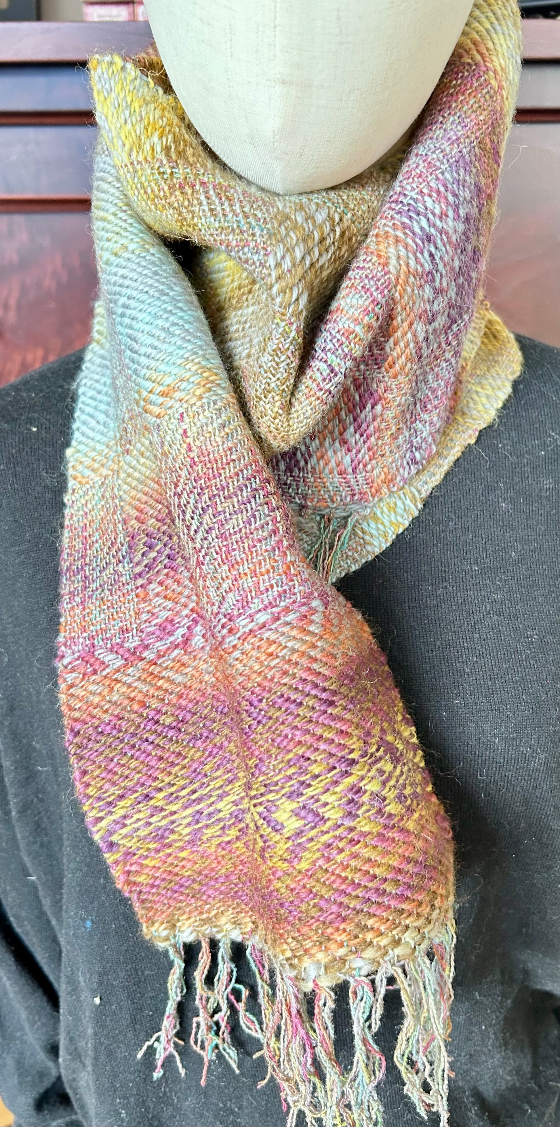 Crafted from a silk warp and soft handspun wool weft, this color-shifting scarf offers both warmth and elegance ideal for fall and winter.