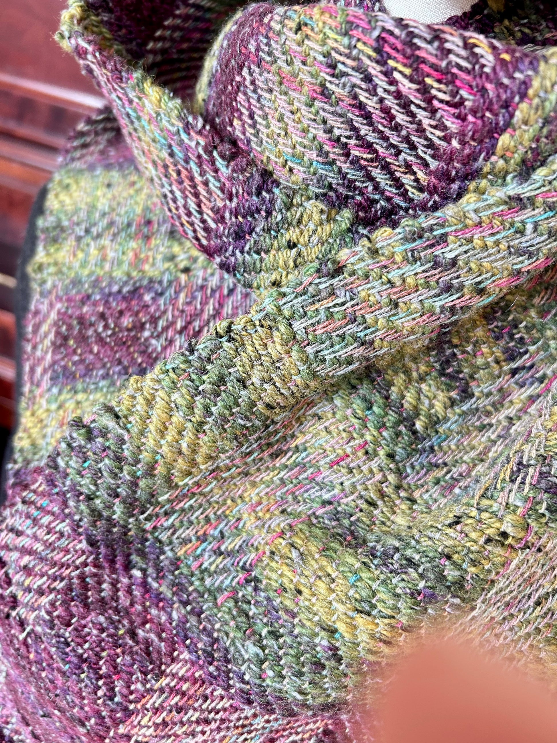 Crafted from a silk warp and soft handspun wool weft, this color-shifting scarf offers both warmth and elegance ideal for fall and winter.