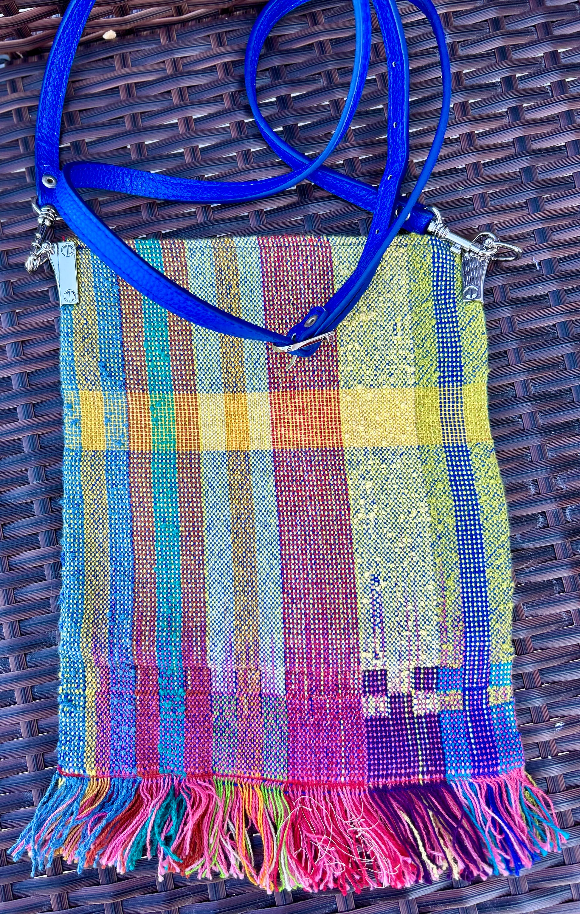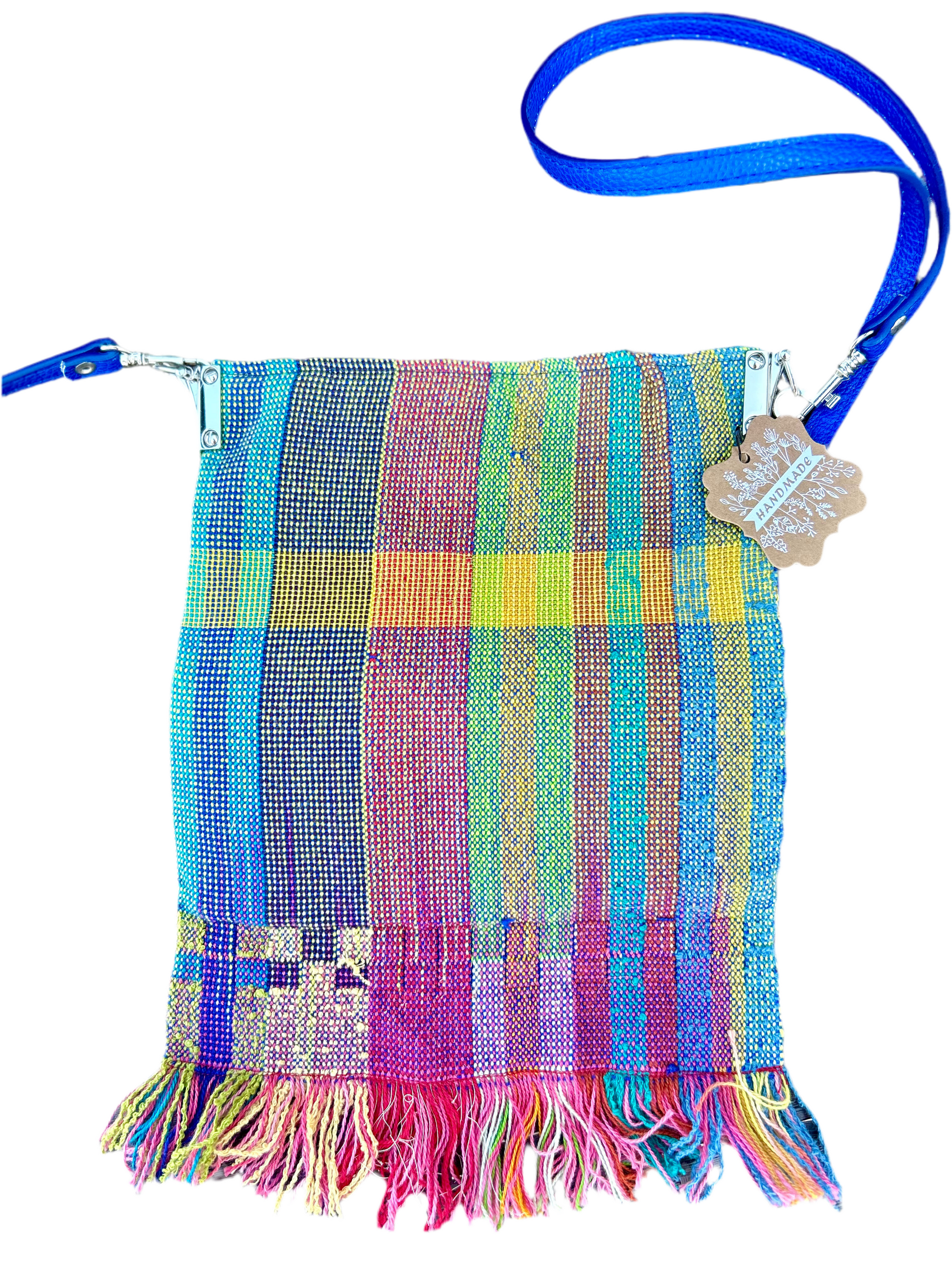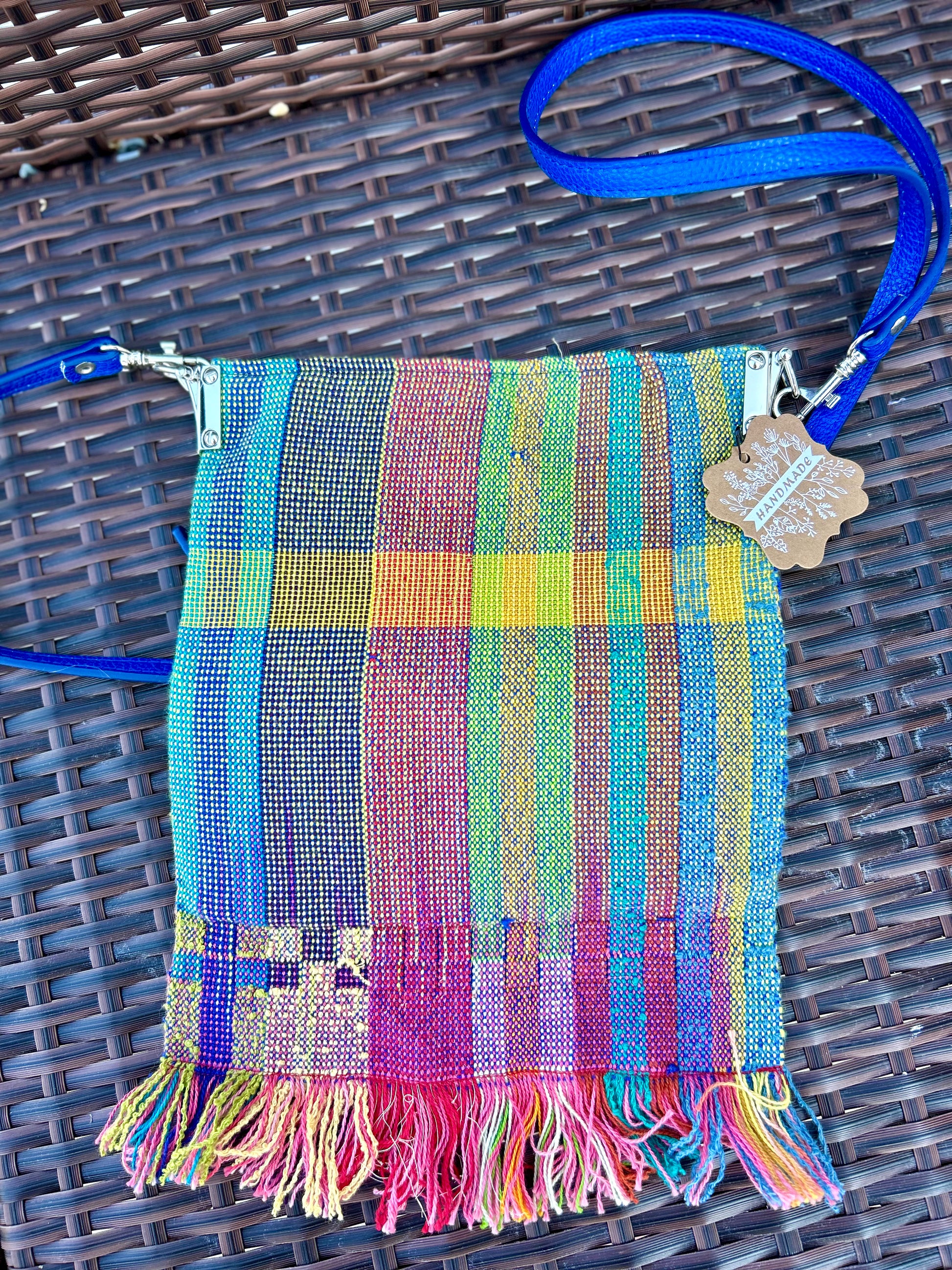This beautiful handbag is colorful and perfect for a sunny spring day! This handwoven cotton with a little bit of sparkle bag is lined with cotton. It's the perfect size for your phone and a few essentials. The bag is interfaced to maintain its shape.