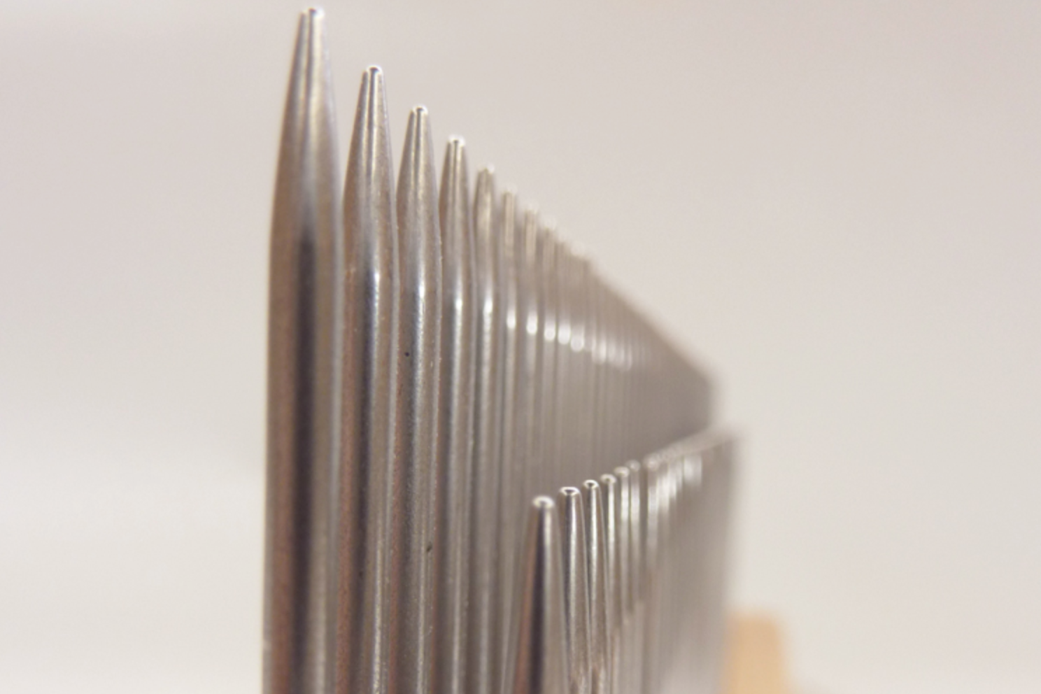 Instead of drilling the hackle base, Majacraft has developed a new technique of bonding the pins in with a very tough resin. The pins are positioned perfectly straight and perfectly even on every hackle.